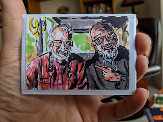 Here are a few sketch cards I made for my dad on my recent visit with him in Arizona. I delved back into the world of bird drawing, and also drew my take on a photo of us at Old Tucson Studios. I started putting my sketch cards in magnetic sleeves, so as to make them more "useful"!